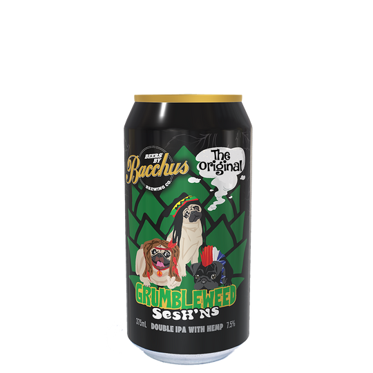 Grumbleweed Sesh'ns ~ The Original (Alc 7.5%) 375mL can. Meet the more sessionable evolution of our untethered, extra-dank, Hemp infused Grumbleweed Triple IPA. Sesh’ns packs all the resinous punch of its 12.8% predecessor into a more approachable ABV. Inspired by our original Pug IPA (which featured a mohawked pug, a cheeky nod to BrewDog's Punk IPA) & the fact that more than a single pug is known as a 'grumble,' the Grumbleweed legend was born.