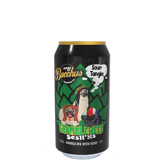 Grumbleweed Sesh'ns ~ Sour Tingle (Alc 7.5%) 375mL can. Meet the more sessionable evolution of our untethered, extra-dank Hemp infused Grumbleweed Triple IPA. Sesh’ns packs all the resinous punch of its 12.8% predecessor into a more approachable ABV. Inspired by our original Pug IPA (which featured a mohawked pug, a cheeky nod to BrewDog's Punk IPA) & the fact that more than a single pug is known as a 'grumble,' the Grumbleweed legend was born.
